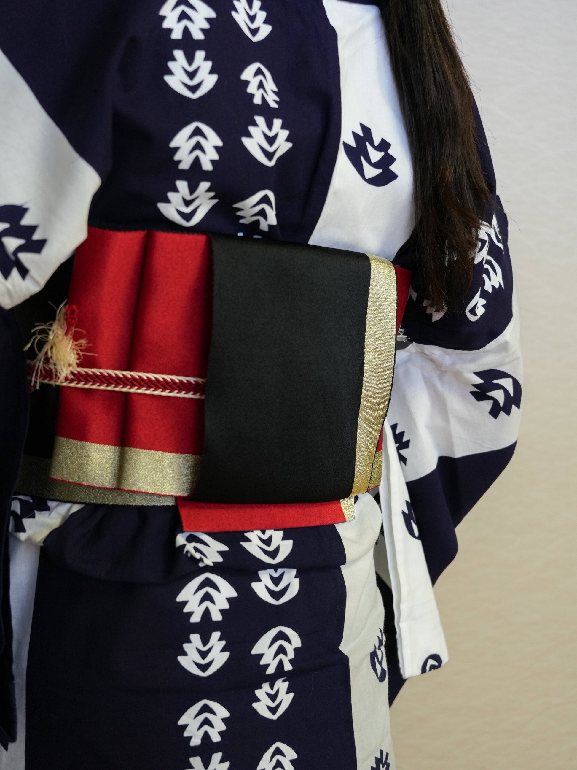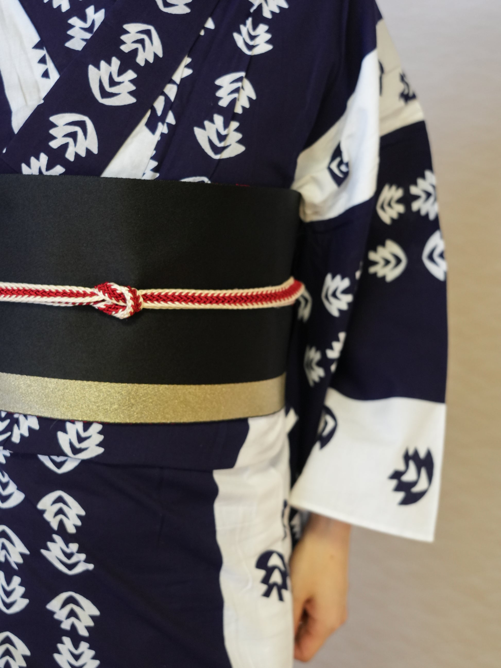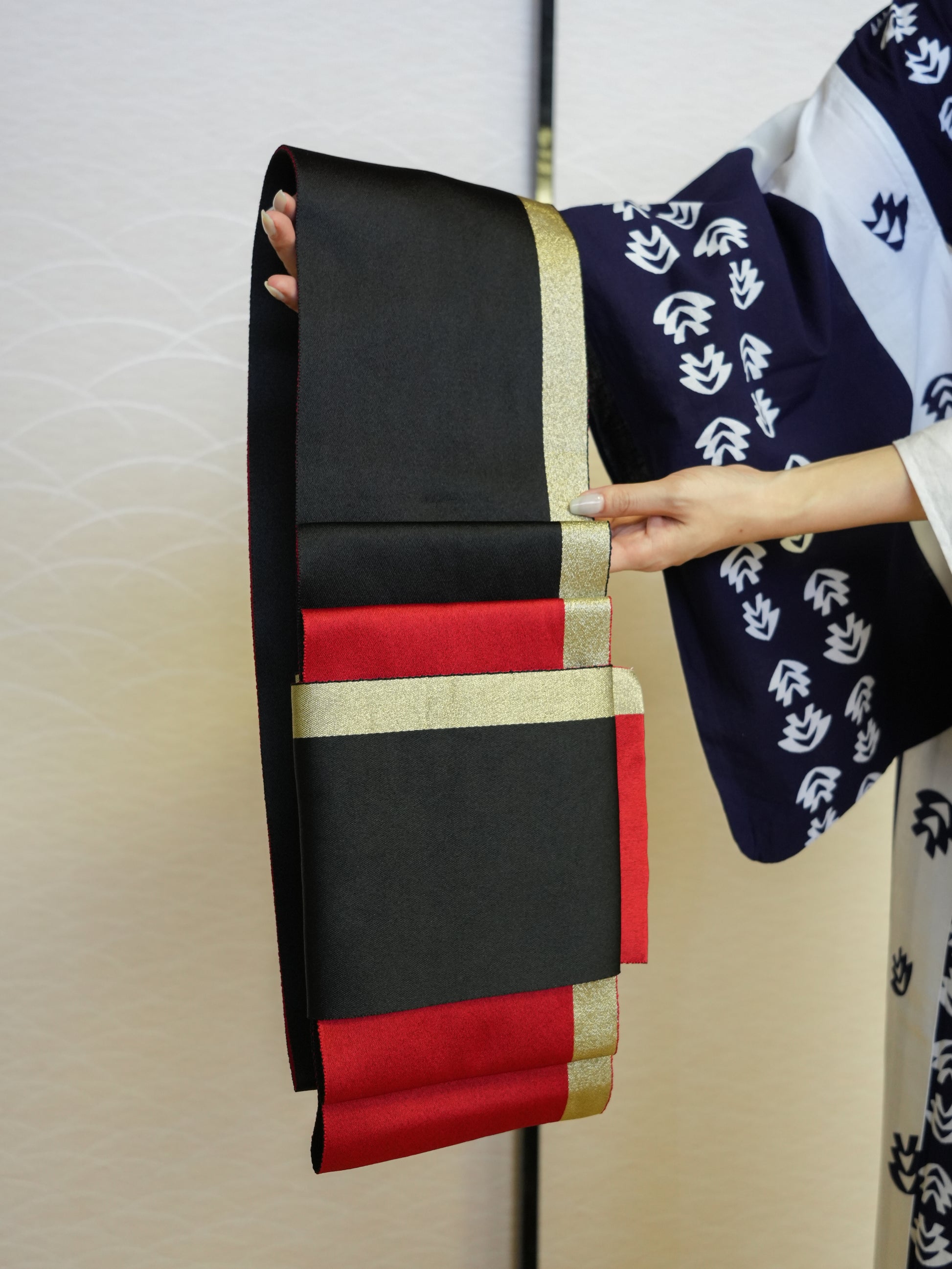 1分で装える、ビンテージの半幅帯を使用した作り帯。