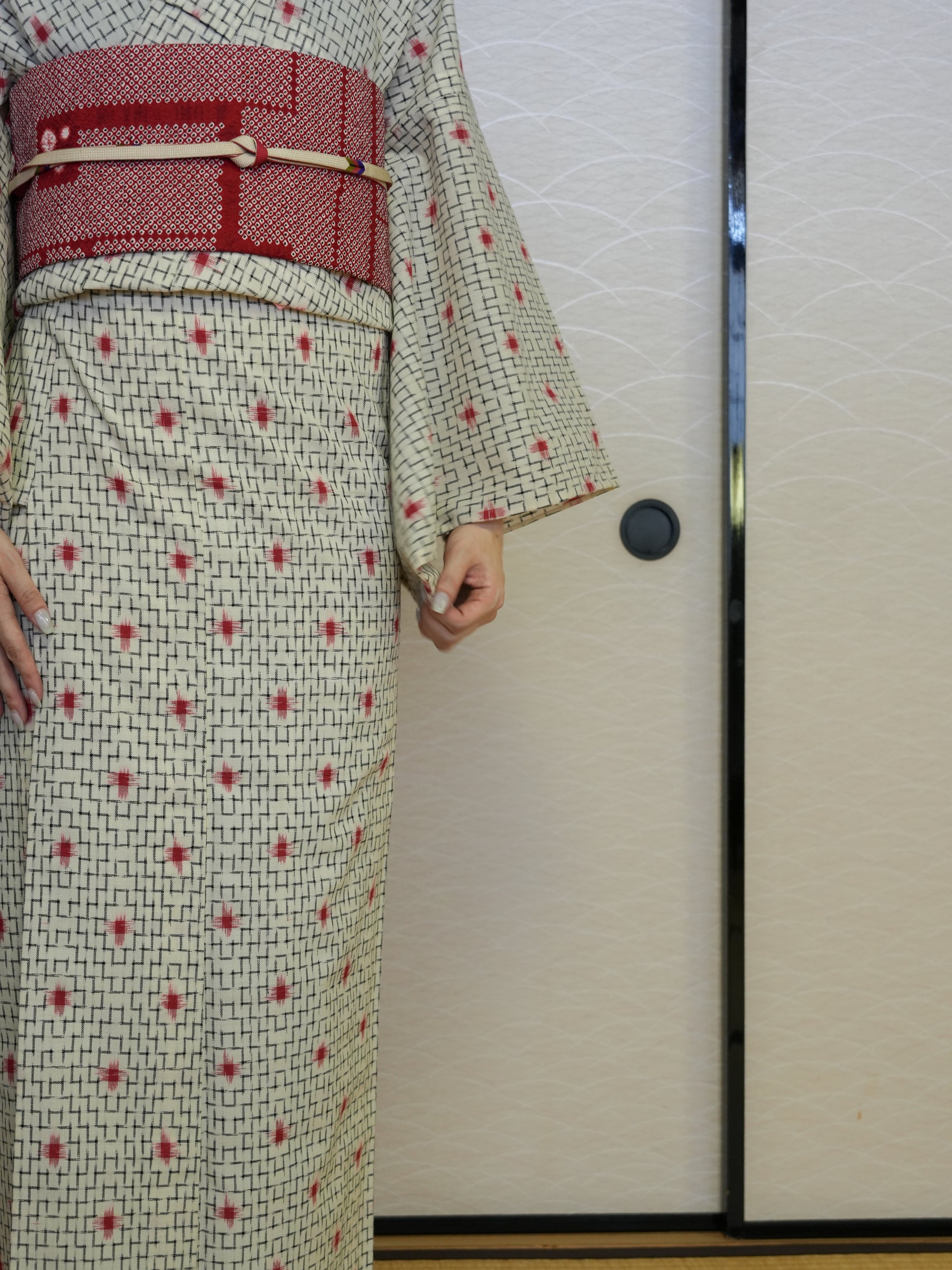 3分で着られるセパレート仕立てと、1分で装えるビンテージの半幅帯を使用した作り帯。