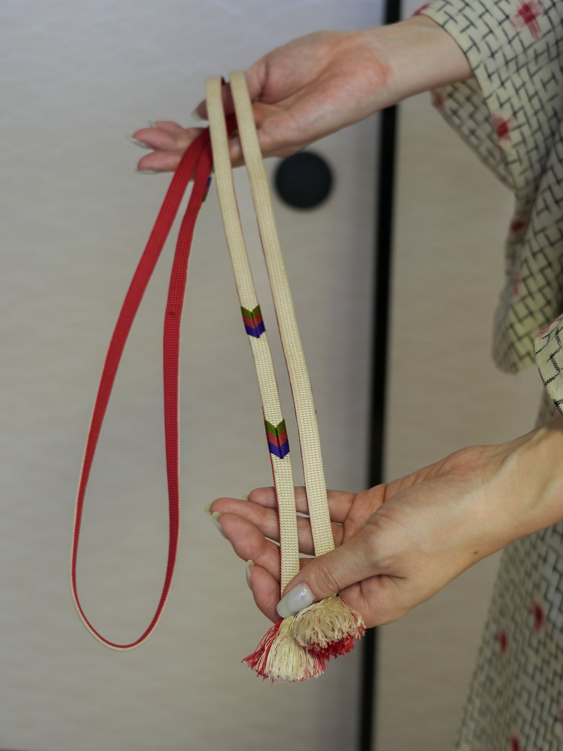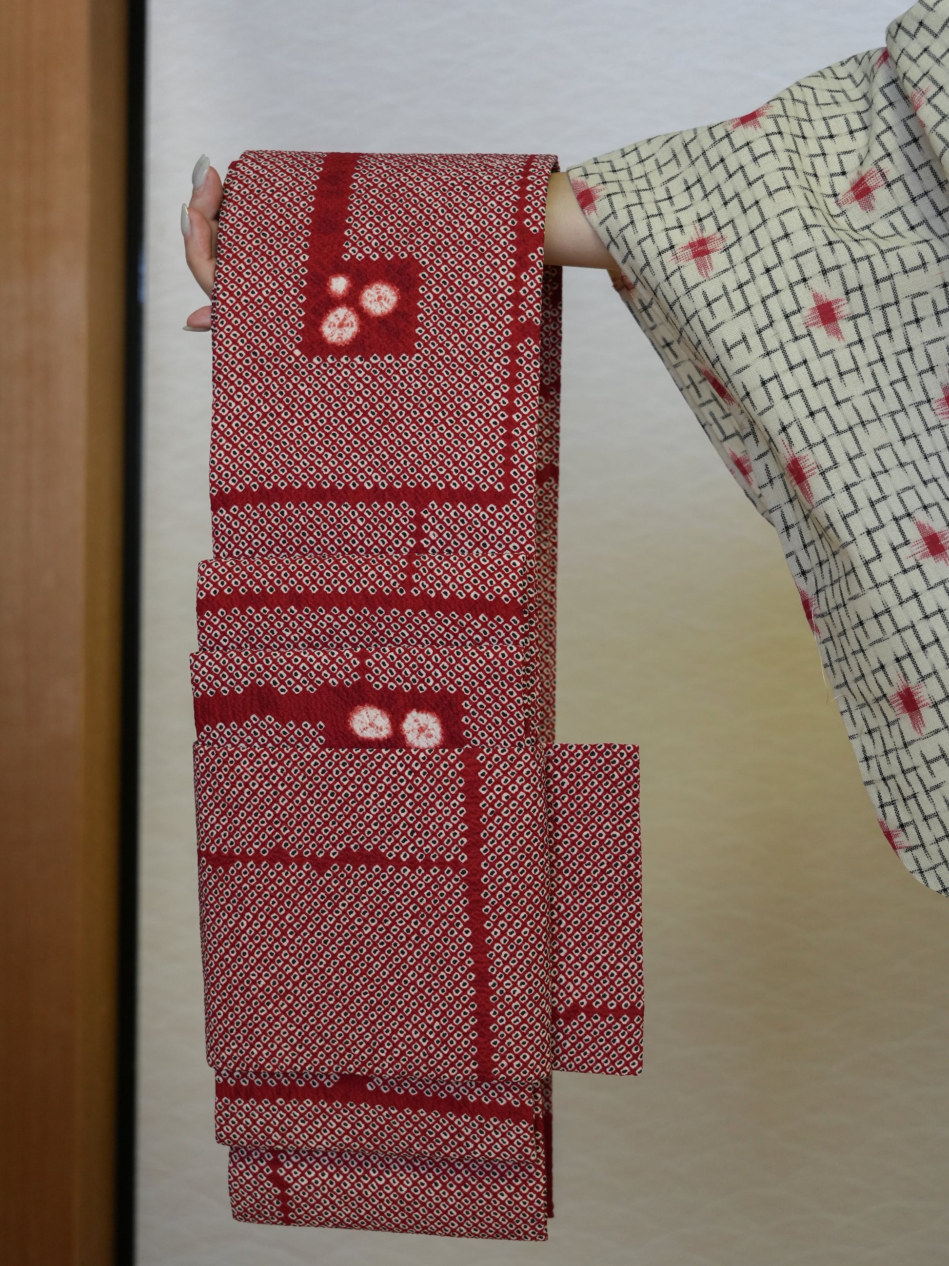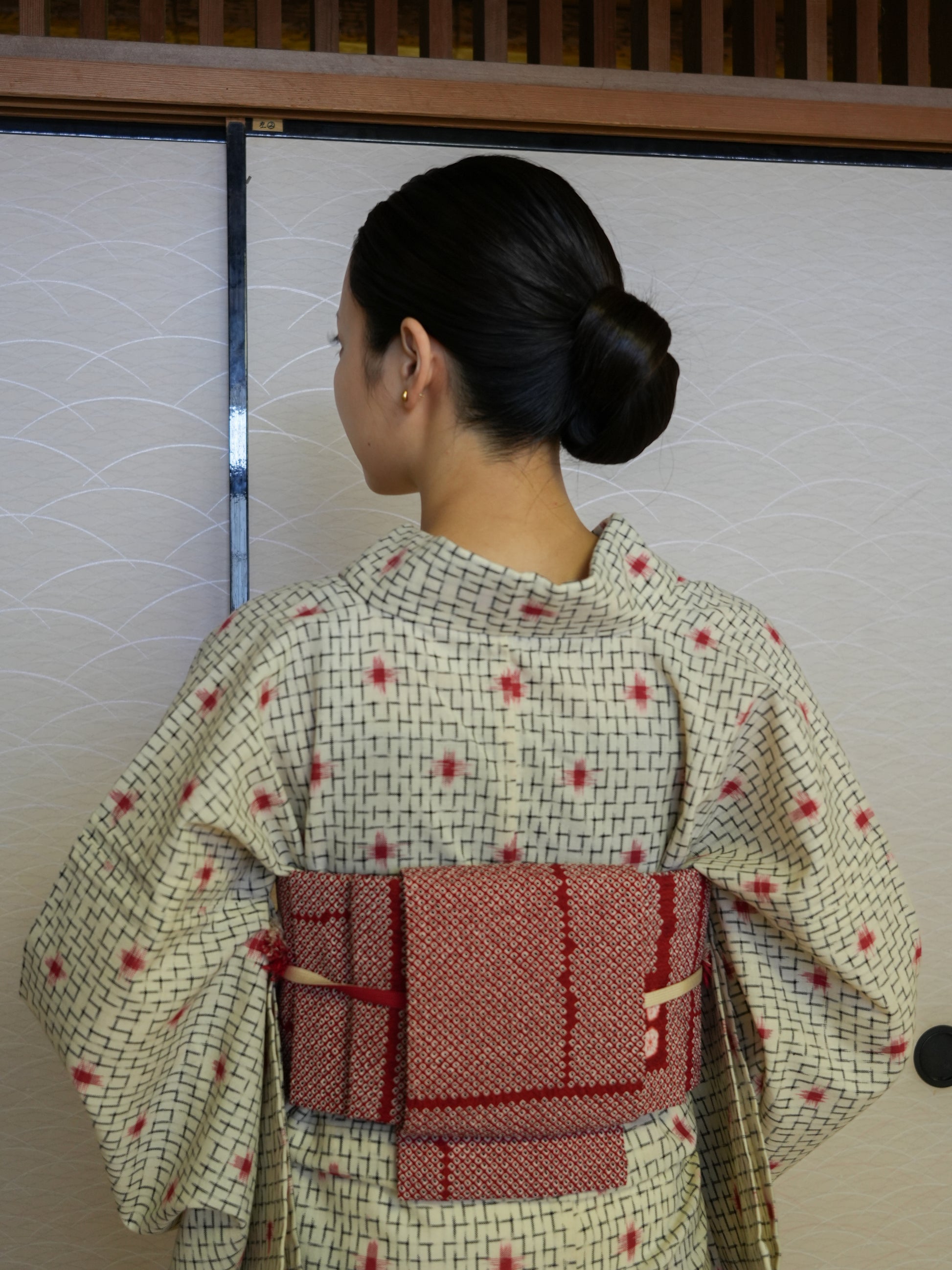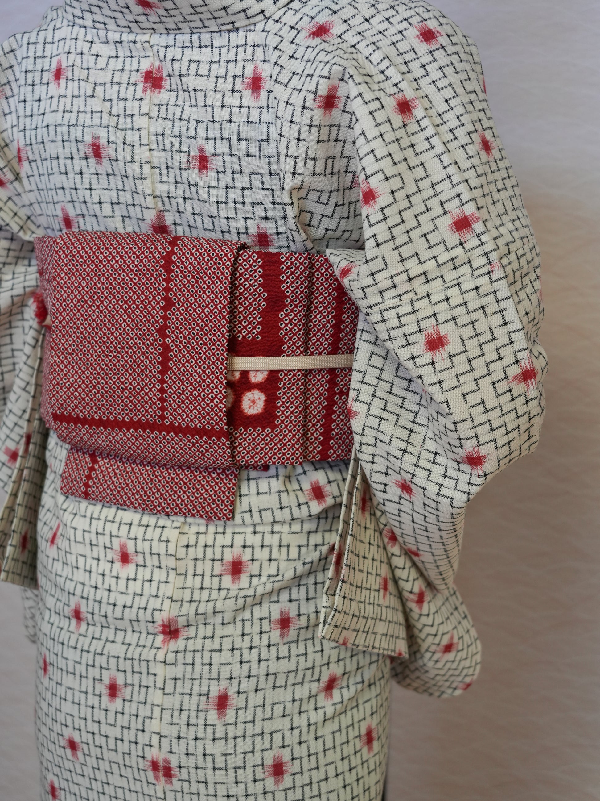 1分で装える、ビンテージの半幅帯を使用した作り帯。