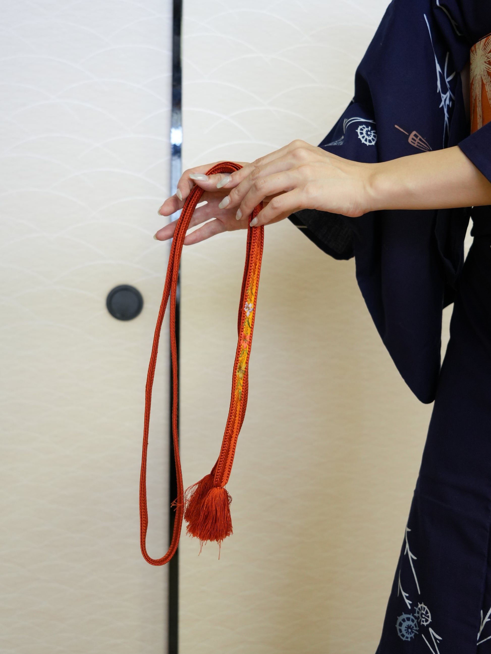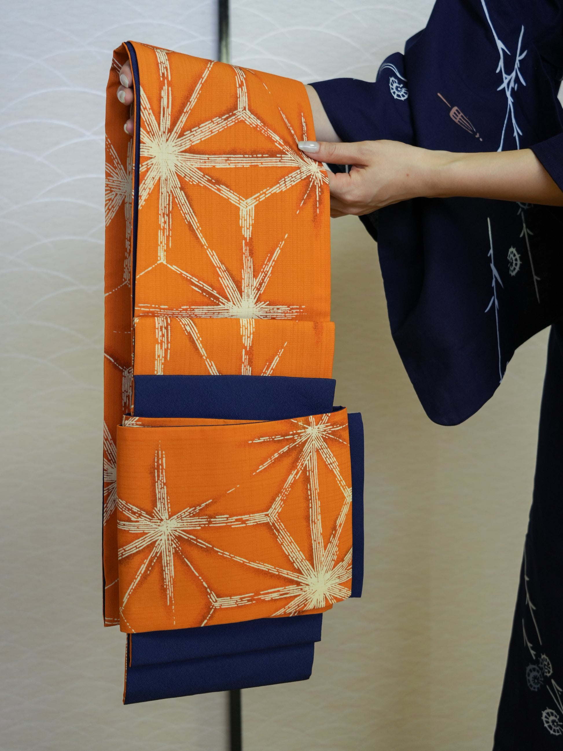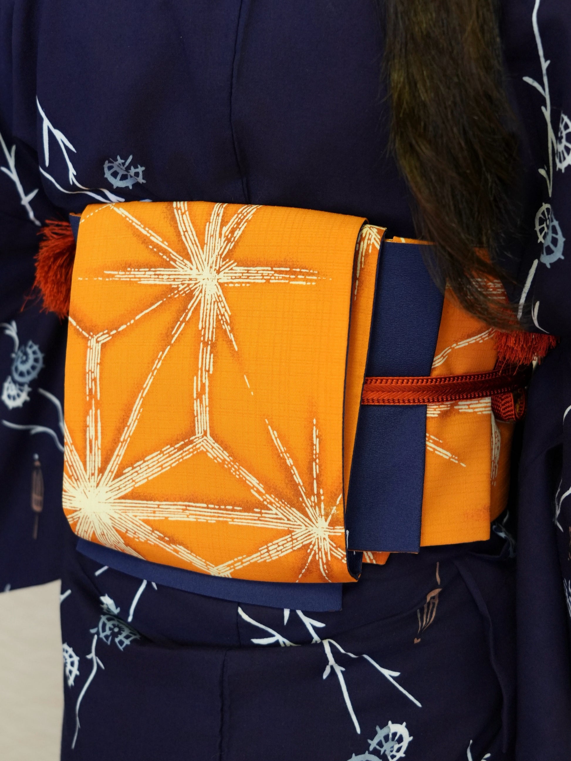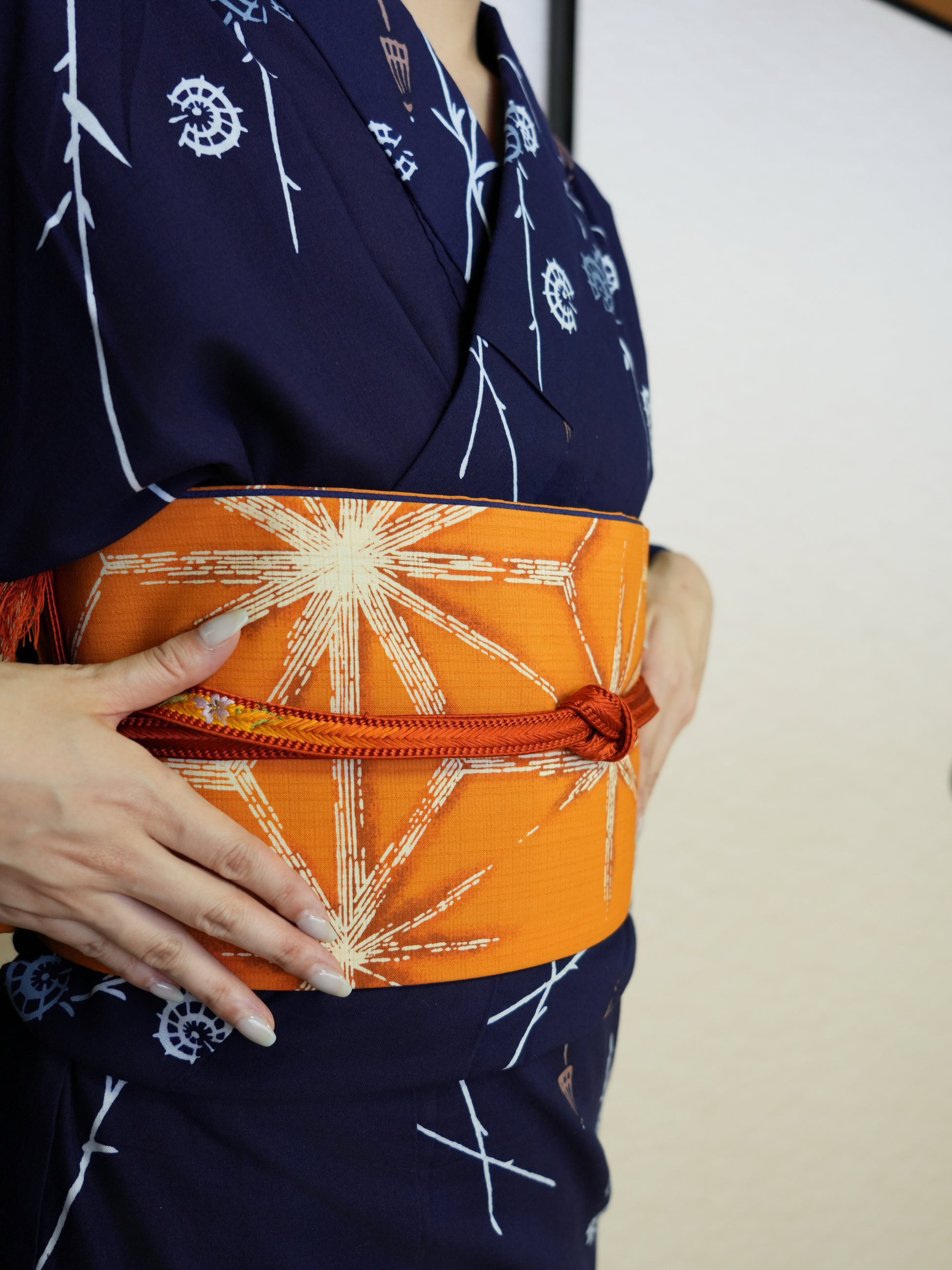 1分で装える、ビンテージの半幅帯を使用した作り帯。